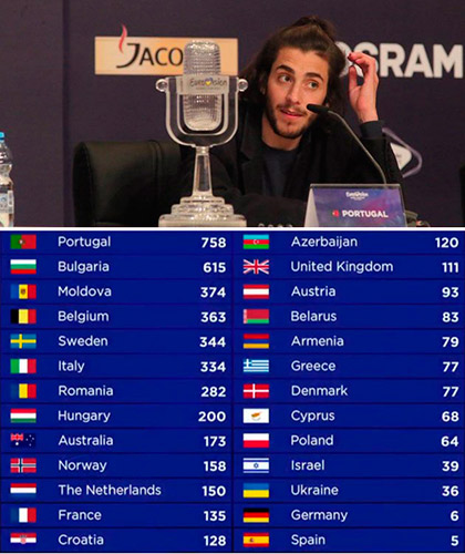 Хоч ╢вробачення-2017 вража╓ нов╕тн╕ми технолог╕ями, якими скористалися практично вс╕ учасники конкурсу, перемогу здобула проста ╕ л╕рична п╕сня "Amar Pelos Dois" у проникливому виконанн╕ Сальвадора Собрала. Номер сп╕вака не вражав граф╕чними ╕ св╕тловими спецефектами, драйвовим бек-вокалом, а проте, за оц╕нками глядач╕в ╕ жур╕, виявився найкращим. ╤ цей факт окреслив тенденц╕ю - ╢вробачення потребу╓ зм╕н, повернення до мелод╕╖, до гармон╕╖, до душ╕ ╕ почутт╕в. Про це сказав, отримуючи нагороду з рук переможниц╕ ╢вробачення-2016 укра╖нсько╖ сп╕вачки Джамали, сам Сальвадор Собрал. "Ми живемо у св╕т╕ музики фаст-фуду. Це перемога для музики... Музика - це не фе╓рверки, музика - це почуття", - п╕дкреслив сп╕вак. А на прес-конференц╕╖, яка в╕дбулася п╕сля гранд-ф╕налу, в╕н зазначив, що хот╕в би, аби його музика ╕ подача ц╕╓╖ музики спонукали до зм╕н в контент╕ цього п╕сенного конкурсу: "Я спод╕ваюсь, що це принесе зм╕ни не т╕льки в контент, але в музику взагал╕ ╕ в поп-музику. Мен╕ хот╕лося б, щоб я м╕г принести цю зм╕ну. Це було б для мене найб╕льше задоволення". Собрал зазначив, що його п╕сня - чудова, емоц╕йна, з л╕ричним меседжем - гармон╕╖. Преса в╕дзнача╓, що 27-р╕чний Сальвадор Собрал - простий ╕ чутт╓вий виконавець, що в╕н ма╓ бездоганний контроль над голосом та особливий магнетизм, що його дебютний альбом "Excuse Me" вийшов минулого року. В╕н вивчав психолог╕ю, але пристрасть до музики взяла гору. В╕н мешкав у США та Барселон╕, де навчався в престижному Taller де Musics. Там працював над к╕лькома ц╕кавими музичними проектами, брав участь в проект╕ Bosa Nova, а також писав музику для себе та орган╕зовував зухвал╕ виступи, черпаючи натхнення у Чета Бейкера. Саме тод╕ його музика ув╕брала в себе особливост╕ звучання Латинсько╖ Америки. Португалець вирвався у л╕дери конкурсу п╕сля першого п╕вф╕налу ╢вробачення. А у ф╕нал╕ перем╕г з неймов╕рним результатом - з 758 балами. Вир╕шальний результат конкурсу став в╕домий п╕сля голосування профес╕йних нац╕ональних жур╕ та телеглядач╕в. Оц╕нки склали р╕вн╕ частини загального результату. Жур╕ оц╕нювали виступи конкурсант╕в п╕д час друго╖ генерально╖ репетиц╕╖ ф╕налу, ввечер╕ 12 травня, а глядач╕ голосували безпосередньо в н╕ч ф╕налу ╢вробачення-2017. Португал╕╖ найб╕льшу к╕льк╕сть бал╕в, по 12, поставили глядач╕ 18 кра╖н. Укра╖нц╕ 12 бал╕в в╕ддали Б╕лорус╕, 10 - Португал╕╖, 8 - Угорщин╕. У голосуванн╕ жур╕ Укра╖н╕ в╕ддали бали т╕льки три кра╖ни: Азербайджан - 7, ╤зра╖ль - 4, Болгар╕я - 1. В╕д жур╕ ╕нших кра╖н-учасник╕в ╢вробачення-2017 Укра╖на отримала по нулю. Бали Укра╖н╕ дали глядач╕ ╤тал╕╖ - 7, Чех╕╖ - 7, Груз╕╖ - 4, Португал╕╖ - 3, Польщ╕ - 2, Б╕лорус╕ - 1. «Укр╕нформ»