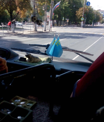 Нещодавно в с╕мферопольськ╕й маршрутц╕ став св╕дком незвичного д╕алогу. Незвичного, бо, як правило, вод╕╖ не люблять пасажир╕в-п╕льговик╕в з ус╕лякими там аусвайсами-посв╕дченнями. Ну, не рад╕ вони ╖м, а от 13-ти живим рублям (ст╕льки кошту╓ про╖зд у С╕мферопол╕) – щаслив╕. До салону важко п╕днялася сходинками бабуся з паличкою – ветеран ус╕х праць, й без посв╕дчення видно, прис╕ла позаду вод╕я ╕ простягнула йому про╖зн╕ стандартн╕ рубл╕. «Н╕, шановна (д╕алог, зрозум╕ло, йшов рос╕йською мовою), я з вас грошей не в╕зьму» – сказав вод╕й, середнього десь в╕ку чорнявий, вусатий чолов╕к. «Як не в╕зьмете, я ж без посв╕дчення» – здивувалася бабуся. «А вам його ╕ не треба – ╕ так все зрозум╕ло» – в╕дказав вод╕й. «Та н╕, у мене його взагал╕ нема, а вам план треба виконувати» – переконувала ж╕нка, наполегливо простягаючи грош╕. «Н╕, не в╕зьму, бо я себе не поважатиму». Бабуся, що на той момент вже поклала т╕ рубл╕ б╕ля вод╕я, була явно спантеличена. «Ну, не ображайте мене, в╕зьм╕ть!» «Н╕-н╕, це ви мене не ображайте, ╕ рух не затримуйте» – дел╕катно, але твердо сказав чолов╕к ╕ в╕дсунув монети назад до бабус╕. До то╖ розмови прислухався вже весь салон, тож зн╕яков╕ла бабуся мусила здатися: «То дай вам Бог здоров’я!» «╤ вам, шановна» – сказав з усм╕шкою вод╕й. ╤ маршрутка рушила. А я т╕льки тод╕ звернув увагу на оц╕ два прапорц╕ б╕ля вод╕я. ╤ тихенько клацнув ╖х на моб╕лку. А решту (тобто, мораль), шановн╕ читач╕, додумайте вже сам╕.
