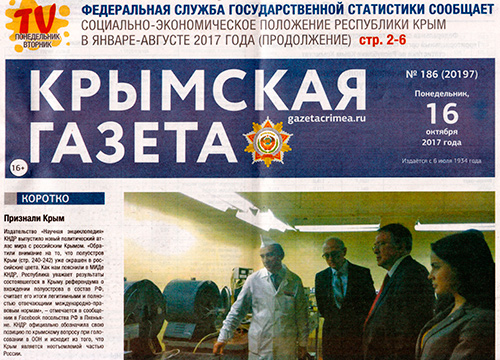 ТИМ ЧАСОМ… ЯКЕ ╥ХАЛО, ТАКЕ Й ЗДИБАЛО? Газета кримського «уряду» - «Крымская газета» 16 жовтня ц.р. запопадливо розм╕стила на сво╖й 1-й стор╕нц╕ - як найважлив╕ше пов╕домлення номера! - ╕нформац╕ю про випущений у П╕вн╕чн╕й Коре╖ атлас, де Крим позначений рос╕йськими кольорами (див. коп╕ю ц╕╓╖ стор╕нки). Тобто, констату╓ видання, П╕вн╕чна Корея поважа╓ результати кримського референдуму про при╓днання до Рос╕╖ ╕ вважа╓ ╖х лег╕тимними, що п╕дтверджу╓ться, зокрема, й голосуванням КНДР з «кримського» питання в ООН. Це вже не «вата»… Це вже повний кримський «пхеньян»…