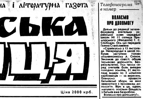 Як ╕ об╕цяли – до чвертьстол╕тнього юв╕лею «Кримсько╖ св╕тлиц╕» завершу╓мо переведення у pdf-формат двох останн╕х м╕сяц╕в 1995 року – листопада ╕ грудня, як╕ скоро з'являться на нашому сайт╕. У цих номерах: в «КС» за 11 листопада 1995 р. – виступ редактора в╕дд╕лу л╕тератури Данила Кононенка на Кримському рег╕ональному конгрес╕ на захист укра╖нсько╖ державност╕ та духовност╕ – «Про мовно-культурну ситуац╕ю в Автономн╕й Республ╕ц╕ Крим». Ось невеличка цитата з ц╕╓╖, як не прикро, й дос╕ актуально╖ промови: «Чому ж це на п'ятому роц╕ незалежност╕ Укра╖ни наша мова, р╕дна мова держави, стала чужою для багатьох державних ос╕б – для урядовц╕в ╕ депутат╕в? Адже переважна б╕льш╕сть з них вперто ╕гнору╓ укра╖нську мову, хоч ╕ добре волод╕╓ нею. Це, як на м╕й погляд, св╕домий виклик наш╕й незалежност╕, сл╕пе плазування перед мовою кра╖ни, яка понад 300 рок╕в пригноблювала наш народ, вигр╕баючи вс╕ земн╕ ╕ духовн╕ багатства з укра╖нсько╖ земл╕…» П╕д заголовком «Слово р╕дне» у тому ж листопадовому числ╕ за 1995 р╕к публ╕ку╓ться сенсац╕йне (а сьогодн╕ це було б ще сенсац╕йн╕шим) пов╕домлення про те, що в дитячому садку с. Мар’ян╕вка Красногвард╕йського району почали вивчати укра╖нську мову. Публ╕куються переклади ще двох в╕рш╕в Тараса Шевченка кримськотатарською мовою – тож зачинався майбутн╕й «Кобзар» кримськотатарською мовою у 1995 роц╕ саме на стор╕нках «Кримсько╖ св╕тлиц╕». В╕дчайдушна телефонограма в редакц╕ю в╕д учительки укра╖нсько╖ мови ╕з с. Приморського про голодн╕ обмороки серед вчител╕в через невиплату зарплати. У номер╕ за 2 грудня 1995 р. – доб╕рка в╕рш╕в та пов╕домлення про прийняття до Нац╕онально╖ сп╕лки письменник╕в Укра╖ни вчителя укра╖нсько╖ мови та л╕тератури, директора Пруд╕всько╖ середньо╖ школи в Сов╓тському район╕ Криму Василя Латанського. ╤ ще – багато ╕нших матер╕ал╕в, у яких заф╕ксована укра╖нська ╕стор╕я Криму. Заглядайте до нашого арх╕ву: http://svitlytsia.crimea.ua/pdf.html *** P.S. Вкотре вже г╕рко доводиться констатувати, що оцифрування арх╕ву «Кримсько╖ св╕тлиц╕», кинутого напризволяще в окупац╕╖ ки╖вськими сп╕взасновниками ╕ видавцем, зд╕йсню╓ться на волонтерських засадах зв╕льненими за незгоду з бездумним переведенням газети до Ки╓ва колишн╕ми прац╕вниками, котр╕ залишилися в Криму ╕ продовжують видавати свою газету в ╤нтернет╕ – http://svitlytsia.crimea.ua ╤ по сьогодн╕шн╕й день з Ки╓ва, де нещодавно в╕дсвяткували «25-р╕ччя» (?) створеного р╕к тому ки╖вського клону «Кримсько╖ св╕тлиц╕», у яко╖ н╕ арх╕ву, н╕ кор╕ння, н╕ ╕стор╕╖, не надходило жодних сигнал╕в, як╕ св╕дчили б про чиюсь турботу, переживання, п╕дтримку – стосовно дол╕ п╕дшивок, матер╕ал╕в, документ╕в ╓дино╖ кримсько╖ укра╖нсько╖ газети ╕ людей, що у Криму продовжують ╖х рятувати. Виходить, що фактично ви в╕дмовилися в╕д ц╕╓╖ ╕стор╕╖, панове. Що ж ви тод╕ святку╓те? Кримськ╕ св╕тличани