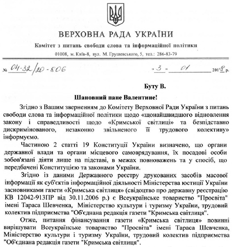 Ми вже ╕нформували наших читач╕в про звернення укра╖нських письменник╕в до Президента Укра╖ни, Голови Верховно╖ Ради Укра╖ни, Голови ком╕тету Верховно╖ Ради Укра╖ни з питань свободи слова та ╕нформац╕йно╖ пол╕тики, М╕н╕стра культури Укра╖ни з приводу нищення в окупованому Криму укра╖нського державницького видання — ╓дино╖ за вс╕ роки Незалежност╕ укра╖номовно╖ газети Криму «Кримська св╕тлиця» - недолугими д╕ями з боку державного п╕дпри╓мства «Нац╕ональне газетно-журнальне видавництво». На сьогодн╕ про свою п╕дтримку «КС» заявили 38 письменник╕в, до яких до╓дналися журнал╕сти, ╕нш╕ небайдуж╕ люди — справжн╕ громадяни сво╓╖ кра╖ни. Першим дуже оперативно, всього через добу, в╕дреагував Апарат ВР Укра╖ни. Головний консультант В╕дд╕лу звернень громадян пан╕ Юл╕я Кравченко пов╕домляла, що звернення було передано до секретар╕ату Голови ВР та секретар╕ату Ком╕тету ВР з питань свободи слова та ╕нформац╕йно╖ пол╕тики. Так само оперативно д╕яв ╕ секретар╕ат вищезгаданого ком╕тету ВР. В╕дпов╕дь було надано першого ж робочого дня нового року. На жаль, вона вражала не лише похвальною оперативн╕стю. Прочитати ╖╖ з першого разу не вдалося — св╕дом╕сть в╕дмовлялася сприймати те, що там було написане. Але прочитавши вдруге, вже й не знав, см╕ятися, чи плакати. Адже виглядало на те, що голова шановного Ком╕тету ВР з питань свободи слова та ╕нформац╕йно╖ пол╕тики пан╕ В╕ктор╕я Сюмар ╕ в оч╕ його не бачила. Просто “п╕дмахнула” приготовану кимось з пом╕чник╕в в╕дписку. Той же, хто готував “в╕дпов╕дь”, уздр╕вши словосполучення "Кримська св╕тлиця" в╕дреагував на нього, як на докучливу муху: нагадав заявников╕, що зг╕дно ч. 2, ст. 19 Конституц╕╖ Укра╖ни органи державно╖ влади ╕ м╕сцевого самоврядування (вони ще тут до чого?), ╖х посадов╕ особи зобов'язан╕ д╕яти лише на п╕дстав╕, в межах повноважень та у спос╕б, що передбачен╕ Конституц╕╓ю та чинними законами Укра╖ни; нагадав, що питаннями ф╕нансування мають оп╕куватися сп╕взасновники газети, серед яких Всеукра╖нське товариство “Просв╕та”, сам трудовий колектив газети — об'╓днана редакц╕я газети “Кримська св╕тлиця” та М╕н╕стерство культури (вийшло з╕ складу сп╕взасновник╕в р╕к тому). Така реакц╕я чиновника з ус╕╓ю очевидн╕стю св╕дчить про те, що зароб╕тчани пана Щекуна, найперше, в╕н сам, таки добряче вс╕м набридли, водячи хороводи п╕д ст╕нами Кабм╕ну, вимагаючи п╕двищення сво╖х посадових оклад╕в та оббиваючи пороги М╕н╕стерства культури, Верховно╖ Ради, аби вибити з бюджету два з половиною м╕льйони на п╕дтримку створено╖ ними в Ки╓в╕ газетки, яку вони називають "Кримською св╕тлицею". Зв╕дси й сприйняття п╕дписант╕в звернення, як прохач╕в за тих клонотворц╕в, за зб╕льшення гарантованого державою ф╕нансування для то╖ газетки, яку ми тут, на п╕востров╕, нав╕ть не бачимо. Сумно, але вкотре перекону╓мося, що наша влада насправд╕ надто далека в╕д реал╕й. Оточивши себе клонами, сурогатами, чи можна спод╕ватись побачити в ╖х компл╕ментарно-викривленому в╕ддзеркаленн╕ св╕й справжн╕й образ? Ця в╕дпов╕дь пан╕ В╕ктор╕╖ Сюмар св╕дчить про те, що моя влада нав╕ть не здогаду╓ться про д╕йсний стан речей з «Кримською св╕тлицею», не зна╓, що н╕якого “переведення” редакц╕╖ «КС» на материк в природ