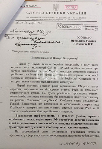 Екс-голова СБУ Олександр Якименко попереджав В╕ктора Януковича про сепаратистськ╕ настро╖ на сход╕ й п╕вдн╕ Укра╖ни 17 лютого 2014 року, направивши листа тод╕шньому голов╕ Адм╕н╕страц╕╖ Андр╕ю Клю╓ву. В╕дпов╕дний розсекречений документ, який надала сторона обвинувачення в суд╕, зачитав головуючий суддя Владислав Дев'ятко, пов╕домля╓ кореспондент «Укр╕нформу». Зокрема, цей розсекречений лист 17 лютого 2014 року був направлений в╕д Якименка до тод╕шнього голови АП Андр╕я Клю╓ва. "Шановний Андр╕ю Петровичу, анал╕з наявно╖ ╕нформац╕╖ св╕дчить про актив╕зац╕ю урядових ╕ недержавних структур РФ, в╕тчизняних пророс╕йських сил в рамках проект╕в, формально спрямованих на захист ╕нтерес╕в рос╕йськомовного населення в умовах загострення сусп╕льно-пол╕тично╖ ситуац╕╖ в Укра╖н╕. Вт╕м, на практиц╕ йдеться про спроби ╕ноземно╖ сторони ╕нсп╕рувати сепаратистськ╕ настро╖ та нав’язати думку про необх╕дн╕сть втручання Рос╕╖ у внутр╕шн╕ справи нашо╖ держави", - йдеться у лист╕. Також у лист╕ зазнача╓ться, що активн╕сть рос╕ян була сконцентрована на сх╕дному та п╕вденному рег╕онах кра╖ни, де було зосереджено "основний пророс╕йський електорат". "Додатковим сприятливим для Москви чинником ╓ те, що м╕сцевий пророс╕йський пол╕тикум, в╕дчуваючи послаблення позиц╕й Парт╕╖ рег╕он╕в на тл╕ масових протест╕в, демонстру╓ ознаки в╕дмежування в╕д центрально╖ влади п╕д гаслами федерал╕зац╕╖ держави та ор╕╓нтац╕╖ на Рос╕ю, як на джерело ╕деолог╕чно╖, ф╕нансово╖ та орган╕зац╕йно╖ п╕дтримки", - уточню╓ться у лист╕. Кр╕м того, у документ╕ наголошу╓ться, що 12 лютого 2014 року в Ялт╕ було проведено всеукра╖нський форум представник╕в облрад, Верховно╖ Ради Автономно╖ Республ╕ки Крим, ╕ що лейтмотивом цього з╕брання стала заява про необх╕дн╕сть децентрал╕зац╕╖ влади в Укра╖н╕, надання рег╕онам б╕льшо╖ самост╕йност╕ та проведення конституц╕йно╖ реформи ╕з затвердженням ново╖ редакц╕╖ Конституц╕╖ на референдум╕. У ╕ншому з розсекречених лист╕в, як╕ сторона обвинувачення презентувала у суд╕ у середу, в╕д екс-голови СБУ Кал╕н╕на до Януковича, направленим у с╕чн╕ 2013 року, зазнача╓ться, що Рос╕я проводила д╕╖ щодо економ╕чно╖, пол╕тично╖ та гуман╕тарно╖ експанс╕╖ Укра╖ни. Як пов╕домлялося, 29 червня 2017 року колег╕я Оболонського райсуду Ки╓ва задовольнила клопотання сторони обвинувачення про спец╕альне судове провадження у справ╕ Януковича.
