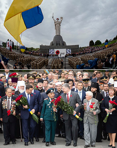 «В╕ддаючи належне величезн╕й рол╕, яку в╕д╕грали у розгром╕ в╕йськ Третього рейху вс╕ держави антиг╕тлер╕всько╖ коал╕ц╕╖, ми, безумовно, пиша╓мося внеском укра╖нц╕в у досягнення сп╕льно╖ перемоги ╕ порятунок св╕ту в╕д нацистського поневолення. Наш народ – знекровлений передво╓нними колектив╕зац╕╓ю, Голодомором, Великим терором тридцятих рок╕в - у полум’╖ всесв╕тньо╖ людсько╖ катастрофи втратив кожного п’ятого доньку та сина», - наголосив Петро Порошенко.