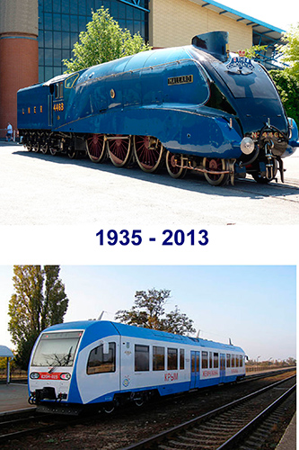 Останн╕м часом все част╕ше натрапля╓мо на пов╕домлення про скоре завершення буд╕вництва швидк╕сно╖ зал╕зниц╕, що сполучить столицю з найб╕льшим аеропортом кра╖ни. Швидк╕сна зал╕зниця! Як вона потр╕бна в наш стр╕мкий час! Кажуть, ц╕╓ю г╕лкою потяги будуть мчати з╕ швидк╕стю 120 к╕лометр╕в на годину, тож дорога в╕д аеропорту до вокзалу забере трохи б╕льше п╕вгодини. А що ж з рештою зал╕зниць? На жаль, через низьку як╕сть зал╕зничного полотна, швидк╕сть руху потяг╕в зал╕зними шляхами кра╖ни залиша╓ бажати кращого. Лише на к╕лькох напрямках курсують по╖зди Intercity, але ╕ ╖х швидк╕сть не перевищу╓ 140 к╕лометр╕в на годину. Не надто вражаюче для XXI стол╕ття, чи не так? ╢ над чим замислитися. Тим б╕льше, якщо взяти до уваги, що якраз вчора минуло р╕вно 83 роки в╕д дня, як з лондонського вокзалу К╕нгз Кросс вийшов в св╕й перший рейс локомотив Ср╕бний Юв╕лей. Спроектований сером Найджелом Грезли, в╕н був як╕сно новим кроком у розвитку не лише тод╕шн╕х паротяг╕в, не лише транспортно╖ ╕нфраструктупи на загал, але й мислення ц╕лого сусп╕льства. Це був час, коли п╕дхльоснута гарячим б╕гом зал╕зних коней, що раптом з клусу з╕рвалися в кар'╓р, ц╕на хвилини, як╕й б╕льш╕сть людства до того не надавала серйозного значення, зросла незм╕римо. Але що ж прикметного було в тому локомотив╕? В той час, як в Н╕меччин╕ в тридцятих роках вже почали будувати дизельн╕ локомотиви (один з яких в якост╕ рейкового автобуса курсував м╕ж Берл╕ном ╕ Гамбургом), в╕рна традиц╕ям Британ╕я ще м╕цно трималася за паротяги. Власне, не лише трималася — вдосконалювала ╕снуюч╕, створювала нов╕ ╖х класи. Створений талантом зал╕зничного ╕нженера Найджела Грезли паротяг Ср╕бний Юв╕лей був головним в новому клас╕ А4. Його вих╕д на сталев╕ маг╕страл╕ був справжн╕м проривом. Новий локомотив — трицил╕ндровий, але лише з двома клапанними коробками, що значно здешевлювало як сам паротяг, так ╕ його експлуатац╕ю, був досконалим не лише з техн╕чного погляду. Не менш важливим було те, що твор╕ння пана Грезли було довершеним ╕ в естетичному сенс╕. Чи не вперше, модель паротяга було продуто в аеродинам╕чн╕й труб╕. Згладжен╕, зализан╕ форми нового локомотива, окр╕м того, що були надзвичайно ефективними, створюючи непор╕вняно менший спротив пов╕тряному потоку, ан╕ж у будь-якого з тогочасних локомотив╕в — а отже, сутт╓во зменшуючи експлуатац╕йн╕ витрати, найперше, економлячи паливо — ще й незм╕нно притягували захоплен╕ погляди сучасник╕в, оск╕льки надавали потужному механ╕зму вигляду справжнього прибульця з майбутнього. Вже п╕д час першого ж виходу, на л╕н╕╖ Лондон — Ньюкасл, Ср╕бний Юв╕лей вив╕в св╕й потяг на швидк╕сть 112 миль на годину (180 км/год). А весь маршрут було подолано за чотири години з середньою швидк╕стю 67 миль на годину. Але то був лише початок. Конкуренц╕я двох зал╕зничних компан╕й LNER та LMS сприяла не лише встановленню рекорд╕в (збудований в 1938 роц╕ локомотив Меллард досяг нечувано╖ на той час швидкост╕ транспортування потягу — 126 миль на годину (203 км/год), але й до зростання середньо╖ швидкост╕. Адже, аби витримувати розклад, нов╕ паротяги зазвичай виходили за меж╕ встановленого на той час л╕м╕ту швидкост╕ 90 миль на годину. Для прикладу, Летючий Шотландець курсував з середньою швидк╕стю 80 миль на годин
