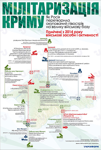 ╤нфограф╕ка «Укр╕нформу» п╕дсумову╓ дан╕ з закрито╖ презентац╕╖ МЗС Укра╖ни в ООН ╕ результати досл╕дження в╕дкритих джерел волонтер╕в укра╖нсько╖ групи “╤нформнапалм” протягом 2014-2018 рок╕в. На н╕й ви побачите, як саме Рос╕я м╕л╕таризувала окупований Крим.