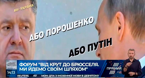 ТИМ ЧАСОМ… Чинний президент Укра╖ни Петро Порошенко, який оф╕ц╕йно заявив про балотування на другий терм╕н, у рамках свого виступу на форум╕ використовував довол╕ дивне гасло, у якому в якост╕ альтернативи йому назива╓ться рос╕йський л╕дер Володимир Пут╕н. В╕дпов╕дне фото опубл╕кувала в Facebook укра╖нська журнал╕стка Мар'яна П'╓цух. "Або Порошенко, або Пут╕н", - св╕дчив слоган, який вивели на екрани п╕д час заходу. У мереж╕ спроба Порошенко залякати укра╖нц╕в Пут╕ним викликала подив ╕ см╕х. "А ви пом╕тили, н╕хто так наполегливо не пропагу╓ голосувати за Пут╕на, як технологи Порошенка?", - поц╕кавився журнал╕ст Леон╕д Швець. "Стар╕ п╕сн╕ про головне", "Кучма або комун╕сти", "Та це просто шедеврально!)", "А вар╕ант╕в, щоб н╕ те, н╕ ╕нше, - нема?", "При совку теж народ лякали ворогами", - в╕дреагували користувач╕ в коментарях. www.unian.ua