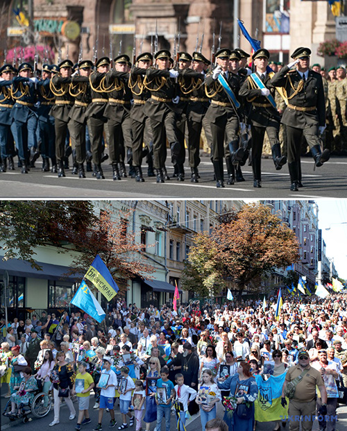 О 8.30 ранку святкового дня ки╖вське метро не дуже велелюдне, тож в оч╕ впадають пани й панянки у гарних вишиванках. У когось в руках кв╕ти. Намагаюся вгадати, куди вони прямують: на Ходу Г╕дност╕ Президента Зеленського, що розпочнеться о 9.30, чи завчасно ╖дуть на альтернативний Марш захисник╕в, запланований на 11 ранку? Замислююся: як так сталося, що у кра╖н╕, де не ск╕нчилася в╕йна, у День Незалежност╕ в╕дбувся такий розпод╕л сусп╕льства на два святкуюч╕ табори?