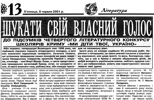 УМОВИ КОНКУРСУ: – Мова конкурсу – укра╖нська. – В╕к учасник╕в – учн╕ 8-11 клас╕в. – Ном╕нац╕╖ конкурсу – «Поез╕я», «Проза», «Публ╕цистика», «Драма». (З 2020 року ном╕нац╕я «Драма» - ╕мен╕ укра╖нського драматурга Ярослава ВЕРЕЩАКА, котрий був членом жур╕ конкурсу у 2019 роц╕). – У ном╕нац╕ю «Поез╕я» конкурсант ма╓ над╕слати 5-8 в╕рш╕в. – У ном╕нац╕╖ «Проза» та «Публ╕цистика» надсилаються роботи на в╕льну тему обсягом 4-8 стор╕нок. – У ном╕нац╕ю «Драма» надсила╓ться п’╓са на один акт обсягом 4-8 стор╕нок. Учасники конкурсу повинн╕ вказати повн╕стю сво╓ пр╕звище, ╕м’я та по батьков╕, в╕к, адресу, навчальний заклад, телефон та електронну адресу. Терм╕н подач╕ конкурсних роб╕т – з 1 с╕чня по 5 кв╕тня 2020 року на електронну адресу газети «Кримська св╕тлиця» – kr_svit@meta.ua Твори учасник╕в Всеукра╖нського л╕тературного конкурсу «Ми – д╕ти тво╖, Укра╖но!» ╕м. Д. Кононенка публ╕куватимуться на ╤нтернет-стор╕нц╕ газети «Кримська св╕тлиця» – http://svitlytsia.crimea.ua Оц╕нюватиме творч╕сть учасник╕в компетентне письменницьке жур╕, до складу якого ув╕йдуть, зокрема, й колишн╕ переможц╕ конкурсу «Ми – д╕ти тво╖, Укра╖но!» П╕дбиття п╕дсумк╕в конкурсу та нагородження переможц╕в в╕дбудеться в м. Ки╓в╕ на Великодн╕ Свята. На переможц╕в чекають дипломи, подарунки та зб╕рка твор╕в молодих автор╕в – переможц╕в та учасник╕в конкурсу. Для формування призового фонду просимо в╕дгукнутись на електронну адресу «Кримсько╖ св╕тлиц╕» однодумц╕в, волонтер╕в, потенц╕йних спонсор╕в. (Кошти можна переказувати на картку «Приватбанку» №4149 4991 3591 4057, або картку «Ощадбанку» №5167 4901 2770 7462 на ╕м’я Польченка Олександра Олес╕йовича). ВПИШ╤ТЬ СВО╥ ╤МЕНА В ╤СТОР╤Ю В╤ДРОДЖЕНОГО УКРА╥НСЬКОГО КОНКУРСУ «З КРИМСЬКИМ КОР╤ННЯМ», ЯКИЙ ЗАЛИША╢ТЬСЯ ЩЕ ОДНИМ МОСТИКОМ ДУХОВНОГО ╢ДНАННЯ КРИМУ З УС╤╢Ю УКРА╥НОЮ! Оргком╕тет *** На ╕люстрац╕╖ – фрагмент публ╕кац╕╖ у «Кримськ╕й св╕тлиц╕» за 2001 р╕к п╕дсумкового огляду результат╕в 4-го л╕тературного конкурсу «Ми – д╕ти тво╖, Укра╖но!», зробленого головою жур╕ конкурсу Данилом Андр╕йовичем Кононенком. Повноц╕нну коп╕ю статт╕ див. на Фейсбук-стор╕нц╕ «КС»: https://www.facebook.com/krymskasvitlytsia