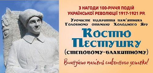 Наближа╓ться день урочистого в╕дкриття першого в Придн╕провському кра╖ пам’ятника в╕йськовому д╕ячу пер╕оду визвольних змагань за в╕льну Укра╖ну – Головному отаману Холодного Яру ╕ вс╕х повстанських загон╕в Костю Пестушку (Степовому-Блакитному). Про╓кт зд╕йсню╓ться виключно за громадською ╕н╕ц╕ативою з нагоди 100-р╕ччя под╕й Укра╖нсько╖ революц╕╖ 1917-1921 рр. ╕ 30-р╕ччя Незалежност╕ Укра╖ни. (Автори: скульптор Олександр Кан╕бор, арх╕тектор ╢вген Голов╕н).