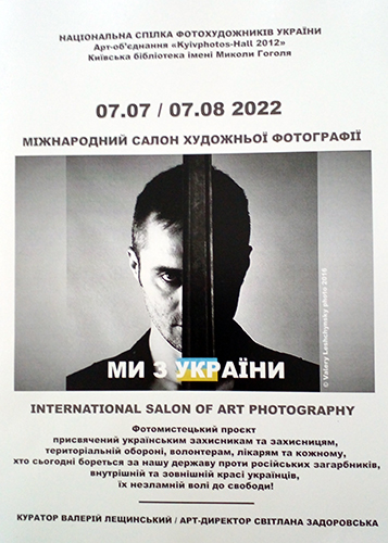 7 липня в прим╕щенн╕ Ки╖всько╖ б╕бл╕отеки ╕мен╕ Миколи Гоголя, в М╕жнародному салон╕ художньо╖ фотограф╕╖ в╕дкрилася виставка «Ми з Укра╖ни». Це фотомистецький проект, присвячений укра╖нським захисникам ╕ захисницям, територ╕альн╕й оборон╕, волонтерам, л╕карям та кожному, хто нин╕ бореться за незалежн╕сть нашо╖ Батьк╕вщини проти московських загарбник╕в, внутр╕шн╕й ╕ зовн╕шн╕й крас╕ укра╖нц╕в, ╖х незламн╕й вол╕ до свободи. Представлено св╕тлини фотограф╕в ╕з Ки╓ва, Дн╕пра, Кропивницького, Львова, Одеси, Харкова, Кам’янця-Под╕льського, а також укра╖нських фотомитц╕в, як╕ живуть за кордоном – в Бохум╕ (Н╕меччина), Спл╕т╕ (Хорват╕я), Париж╕ та ╤тал╕╖.