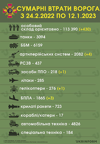 Ми з╕брали для вас ╕нформац╕ю про триста двадцять трет╕й день Велико╖ в╕йни: чим жили Укра╖на та укра╖нц╕ 12 с╕чня 2023 року.