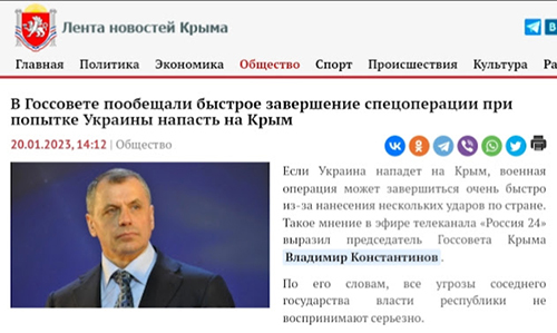 Нараз╕ пророс╕йськ╕ кримськ╕ мед╕а активно тиражують заяви рос╕йських чиновник╕в, розпов╕дають про вигадан╕ «во╓нн╕ злочини укра╖нсько╖ арм╕╖», а майбутн╓ визволення п╕вострова в╕д рос╕йсько╖ окупац╕╖ називають «нападом Укра╖ни на Крим».