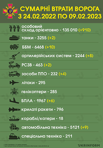 Ми з╕брали для вас ╕нформац╕ю про триста п’ятдесят перший день Велико╖ в╕йни: чим жили Укра╖на та укра╖нц╕ 9 лютого 2023 року.