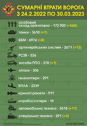 Ми з╕брали для вас ╕нформац╕ю про чотирьохсотий день Велико╖ в╕йни: чим жили Укра╖на та укра╖нц╕ 30 березня 2023 року.