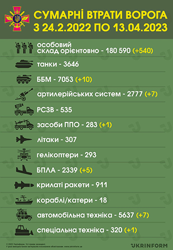Ми з╕брали для вас ╕нформац╕ю про чотириста чотирнадцятий день Велико╖ в╕йни: чим жили Укра╖на та укра╖нц╕ 13 кв╕тня 2023 року.