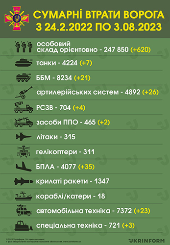 Ми з╕брали для вас ╕нформац╕ю про п’ятсот двадцять шостий день Велико╖ в╕йни: чим жили Укра╖на та укра╖нц╕ 3 серпня 2023 року.