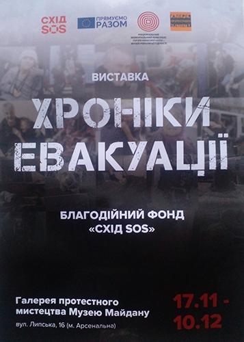 17 листопада в Галере╖ протестного мистецтва Музею Майдану в Ки╓в╕ в╕дкрилася виставка «Хрон╕ки евакуац╕╖». Виставку орган╕зував Благод╕йний фонд «Сх╕д SOS” (ран╕ше БФ «Восток SОS”). У 2014 роц╕ Фонд створили актив╕сти Правозахисного центру «Поступ» ╕ громадського сектору ╢вромайдану в м╕ст╕ Луганськ та Правозахисного центру «Д╕я» у Криму.