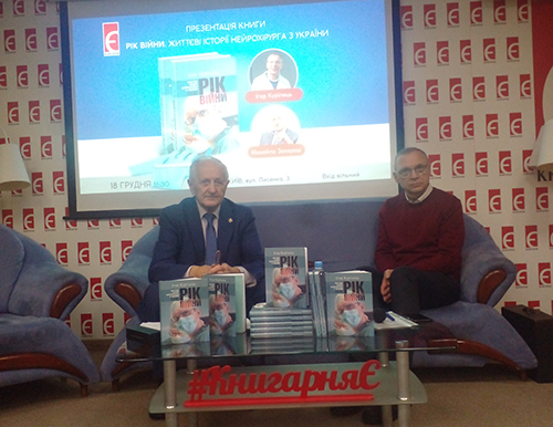 18 грудня х╕рург вищо╖ категор╕╖, доктор медичних наук, професор ╕ член-кореспондент Нац╕онально╖ академ╕╖ медичних наук Укра╖ни Михайло Захараш пров╕в у ки╖вськ╕й книгарн╕ «╢» презентац╕ю книги нейрох╕рурга вищо╖ категор╕╖, кандидата медичних наук ╕ генерального директора М╕жнародного центру нейрох╕рург╕╖ ╤горя Кур╕льця «Р╕к в╕йни. Житт╓в╕ ╕стор╕╖ нейрох╕рурга з Укра╖ни».