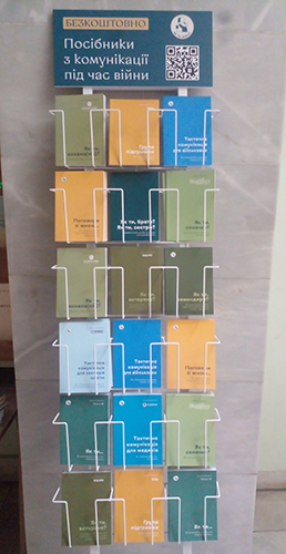 Пос╕бники блакитно╖ сер╕╖ висв╕тлюють адаптування комун╕кац╕╖ в нових умовах: в закладах осв╕ти (як сп╕лкуватися з учнями та ╖хн╕ми батьками п╕д час в╕йни), для медик╕в (як п╕дтримувати тих, хто вижив) ╕ для в╕йськових (як сп╕лкуватися в умовах страху та стресу).