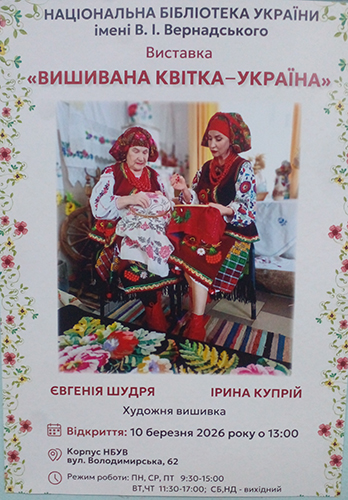 В Нац╕ональн╕й б╕бл╕отец╕ Укра╖ни ╕мен╕ В.╤. Вернадського в╕дкрилася виставка "Вишивана кв╕тка - Укра╖на". Тут експону╓ться вишивка в╕домо╖ в Укра╖н╕ та за рубежем майстрин╕ ╢вген╕╖ Стефан╕вни Шудр╕ та ╖╖ учениц╕ ╤рини Купр╕й.