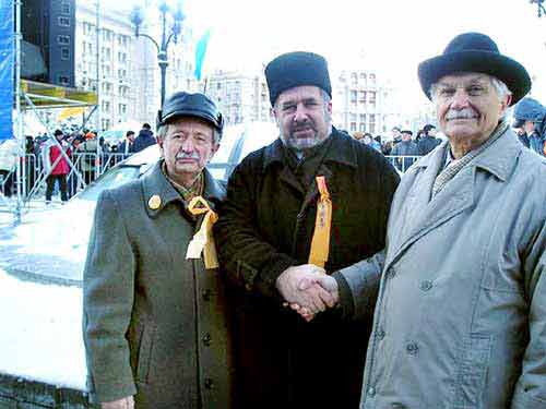 На фото: Де ще зустрічатись, як не на Майдані? Зліва направо: Михайло Горинь, Рефат Чубаров, Петро Кононенко.