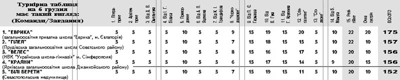 Хто б міг подумати, що "Гілея", команда із села Пруди Совєтського району, на самому фініші, вже через "не можу" перестрибне через фінішну лінію, випередивши всього на одне очко двох своїх суперників. І хіба можна було передбачити, що дві наступні команди - "Велес" із Сімферопольської української гімназії та "Краяни" із Ярківської загальноосвітньої школи Джанкойського району - наберуть однакову кількість очок, поділивши 3 - 4-те місця. Як бути? Проводити серед них додаткове змагання? Та хіба це було б чесно - за крок до комп'ютера "організувати" якійсь із команд таку підступну підніжку?