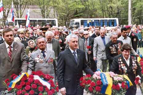 Українці - жертви рабської і примусової праці націонал-соціалізму під час Другої світової війни - мають отримати останні компенсаційні виплати за рахунок німецьких коштів до кінця 2005 року, заявив член правління Німецького федерального фонду "Пам`ять, відповідальність і майбутнє" Гюнтер Заатхофф, виступаючи на урочистих зборах Українського національного фонду "Взаєморозуміння і примирення", присвячених 60-річчю Перемоги у Великій Вітчизняній війні. Через посередництво УНФ "Взаєморозуміння і примирення", створеного у 1993 році, вже понад 800 тисяч жертв гітлерівського націонал-соціалізму в Україні отримали від Німецького федерального фонду "Пам`ять, відповідальність і майбутнє" компенсаційні виплати на суму понад 800 млн. євро. Офіційно виплати коштів німецькою стороною остаточно припиняються після 30 вересня 2006 року. На фото В. РУДЕНСЬКОГО - миттєвості ювілейного Дня Перемоги у Сімферополі.