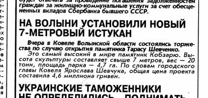 "На Волыни установили новый 7-метровый истукан" - з таким заголовком у "Крымской правде" за 23 серпня 2005 р. було надруковане повідомлення про відкриття у Ковелі пам`ятника Тарасу Шевченку (див. ілюстрацію).