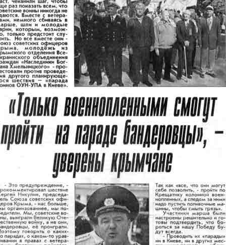 7 жовтня в Сімферополі пройшов марш-хода «Нет бандеровщине!», ініційований Спілкою радянських офіцерів Криму, передало Кримське агентство новин. В акції взяли участь понад 60 представників Союзу радянських офіцерів Криму, Кримського відділення об’єднання громадян “Единство”, а також громадського об’єднання “Наследники Победы”. За словами голови Союзу радянських офіцерів Криму Сергія Нікуліна, акція протесту пройшла у зв’язку з наміром ветеранів ОУН-УПА провести в Києві парад на Хрещатику. Він вважає, що їм, ветеранам ОУН-УПА, можна «пройти по Крещатику колонной военнопленных так, как это было в 1944 году». «Каких-то парадов проводить в Киеве мы не позволим, и говорим: сидите дома, господа бандеровцы, и не высовывайтесь, ваше время уже прошло!» - відзначив С. Нікулін. Він також попередив, що у випадку проведення подібного параду лівоцентристські сили України привезуть сотні тисяч прихильників і проведуть такий парад, «что им мало не покажется». * * * 9 жовтня у Севастополі на площі ім. Нахімова Севастопольське молодіжне об’єднання “Прорив” провело мітинг проти проведення 15 жовтня в Києві параду воїнів ОУН-УПА. Про це Кримському агентству новин повідомив перший заступник голови Молодіжного громадського об’єднання “Прорив” Олександр Дубровський. Як повідомив О. Дубровський, в акції протесту брали участь близько двохсот чоловік. В активістів організації “Прорив” у руках були гасла «Мы прорвемся» і «Реабилитация фашизма - это преступление против человечества». “Сам факт того, що подвиг радянського солдата ставиться під сумнів і перші особи держави намагаються реабілітувати фашизм, зайвий раз підтверджує те, що існуюча влада не має морального права представляти наш народ і нашу державу”, - сказав Олександр Дубровський. Також свою підтримку мітингуючим продемонстрували представники інших громадських організацій і деяких депутатів Севастопольської міськради. * * * 10 жовтня в Сімферополі перед представництвом Президента України в Криму майже 400 представників Кримського молодіжного об’єднання “Прорив” з Бахчисарая, Севастополя, Євпаторії провели всекримський мітинг протесту проти проведення 15 жовтня в Києві параду членів ОУН-УПА, передало Кримське агентство новин. Учасники мітингу тримали в руках гасла: «Не отдадим нашу победу фашистам», «Мы прорвемся», «Реабилитация ОУН-УПА - преступление против человечества». Учасники мітингу прийняли резолюцію, у якій говориться, що “ВР України втратила моральне право представляти своїх виборців з того моменту, як тільки був зареєстрований проект закону про визнання воїнів ОУН-УПА і членів дивізії СС “Галичина” воюючою стороною, із присвоєнням їм відповідних пільг і привілеїв”. “Нам особливо соромно за Президента, що наполегливо рухається до визнання ВР України ОУН-УПА”, - підкреслюється в резолюції. 14 - 15 жовтня ми виїжджаємо в Київ, щоб виступити проти параду ОУН-УПА. Будемо діяти всіма законними методами”, - підкреслив лідер “Прориву” Олексій Добичін. Як уже повідомляло агентство, молодіжне об’єднання “Прорив” було створене в серпні 2005 р.
