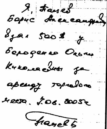 Є тисяча способів, як отримати «ліві» гроші. А 1001-й винайшли в смт. Миколаївці Сімферопольського району. І спокійнісінько роблять це під "дахом" місцевої влади. Схема проста. Миколаївський ринок укладає угоду з комунгоспом про розрахунки зі збирання грошей за торгові місця, хоча торговий люд підписував угоду про це із сільською радою. А гроші тим часом збирає... взагалі четверта сторона - посередники. У такий спосіб, наприклад, з пані Халілової отримали 8000 грн., які нібито повинні піти на розвиток інфраструктури Миколаївки. Загалом з торгових людей зняли десятки тисяч гривень (до слова, торгових місць більше дев’яноста, а зареєстровано - 65). Один з таких «збирачів» грошей - Борис Пацев - отримав від селищної ради доручення на організацію торговельної діяльності. От і "організовує": з громадянки Ольги Бороденко він "без страху і докору" стягнув 500 американських доларів, ще й розписку їй дав про отримання грошей (див. копію), а фактично хабара. Тому пані Ольга, від гріха подалі, й написала заяву у відділ з боротьби із корупцією Державної податкової адміністрації України. Але чи допоможе це повернути «ліві» гроші в державну казну - невідомо. Так само, як невідомо, скільки тіньових коштів Крим знову втратив і у цей курортний сезон. А це ж - наш спільний державний добробут...