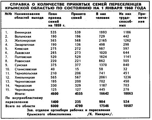 Статистика у більшості цивілізованих країн світу є найбільш об’єктивною, неупередженою і аполітичною наукою. Про радянську статистику ще й донині розповідають всілякі анекдоти та жарти. Безперечно, що перш за все стосується економічних здобутків та соціальної сфери більшовицької статистики. Проте і у радянській статистиці існували сфери, які не піддавалися фальшуванню. Процес переселення та міграції населення у країні були саме тими підрозділами, які не зазнавали партійного фальшування та чиновницького волюнтаризму. Адже широкомасштабне переміщення великої маси людей з однієї республіки до іншої, потребувало значних фінансових витрат. Цей показник підлягав жорсткому контролю не лише з боку партійних органів, але й всесильного КДБ. Ще батько народів Йосип Сталін, як великий мастак з переселення народів та облаштування мільйонів арештантського люду на 1/6 земної кулі, запровадив чітку статистику перевезень і фінансових витрат. Отже, така статистика є вельми добротною і достовірною. Не випадково, що партійні директиви й урядові постанови щодо переселення людності мали гриф «секретно». Статистичні матеріали з історії післявоєнного заселення Криму надзвичайно цінні з наукової точки зору. Для мислячих людей (а сьогодні саме ця категорія населення домінує в Україні) зазначена інформація дозволяє зробити висновок про те, кого переселяли у повоєнний Крим і хто відбудовував вщент зруйнований півострів. На суд читача сьогодні ми подаємо лише кілька документів - витяги з протоколів засідань бюро Кримського ОККПУ за травень 1956 року і довідки про кількість переселенців з України до Криму за 1955, 1957 та 1960 роки. Український державний архів зберігає у своїх сховищах сотні кілограмів статистичних матеріалів щодо повоєнного заселення Криму. Навіть ці окремі аркуші переконливо доводять, що весь тягар розбудови Криму у повоєнні роки ліг на плечі України і українського народу. Від себе додам, що переселення української людності до Криму згідно з постановою Державного комітету оборони № 6372-С розпочалося ще у вересні 1944 року. Українців до Криму завозили не лише із степових областей України, але із кубанських та донських станиць. За період з 1944 по 1946 років на Південнобережжя, у гірський та передгірний Крим було переселено 18 040 сімей. Упродовж 1950 - 1952 рр. у колгоспи і радгоспи півострова переселили ще 9034 сімей. Як бачимо, до Криму переселяли український люд переважно із Західної та Центральної України, тобто з регіонів, де населення традиційно вирізнялось високою національною свідомістю та патріотизмом. Одночасно за вказівкою Кремля всіляко заохочувалося переселення російського етносу до Закарпаття, Прикарпаття, у центральні, південні та східні області УРСР. Саме у цей період спостерігається різке збільшення російського населення не лише у всіх містах, містечках, селищах, але і у сільській місцевості по всій Україні. Отже, комуністична імперія у такий спосіб творила на теренах України «русскоязычное население». З 1954 року переселення до Криму за державною програмою проводилося лише з 15 областей Української РСР: Вінницької, Волинської, Житомирської, Закарпатської, Івано-Франківської (Станіславської), Київської, Львівської, Полтавської, Рівненської, Тернопільської, Хмельницької (Кам’янець-Подільської), Черкаської, Чернігівської т