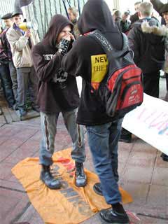 22 листопада 2006 р. у С╕мферопол╕ б╕ля ст╕н кримського парламенту близько п╕втисяч╕ представник╕в Парт╕╖ рег╕он╕в, Рос╕йського блоку, Прогресивно╖ соц╕ал╕стично╖ парт╕╖ та ╢враз╕йсько╖ сп╕лки молод╕ Криму провели м╕тинг проти Помаранчево╖ революц╕╖. "Геть помаранчевих! Розчави оранжизм!" - вигукували актив╕сти ╢враз╕йсько╖ сп╕лки молод╕ Криму, демонструючи сво╓ ставлення до святкування друго╖ р╕чниц╕ Помаранчево╖ революц╕╖, розчавили десяток помаранчевих кульок ╕ потопталися чоб╕тьми по прапору з написом "Так! Ющенко!" (на фото). Один з орган╕затор╕в акц╕╖ Костянтин Книрик заявив, що його товариш╕ планували чавити апельсини, але в╕д них багато бруду ╕ правоохоронц╕ могли приписати учасникам м╕тингу хул╕ганство, тож фрукти зам╕нили на пов╕трян╕ кульки. На м╕тинг п╕д ст╕нами кримського парламенту, окр╕м "╓враз╕йсько╖" молод╕, що прийшла у чорних масках на обличчях, з╕бралися представники Парт╕╖ рег╕он╕в, Рос╕йського блоку ╕ Прогресивно╖ соц╕ал╕стично╖ парт╕╖. Учасники м╕тингу назвали сьогодн╕шн╕й День Свободи "Днем ганьби" ╕ заявили, що Крим постраждав в╕д пол╕тики "помаранчевих" найб╕льше з ус╕х рег╕он╕в Укра╖ни. Вони також висловили свою п╕дтримку пол╕тиц╕ Парт╕╖ рег╕он╕в та Антикризово╖ коал╕ц╕╖, зокрема, т╕╓╖, що спрямована на "досягнення пол╕тичного р╕вноправ'я двох державотворчих культур - рос╕йсько╖ та укра╖нсько╖". Один з л╕дер╕в кримсько╖ орган╕зац╕╖ Парт╕╖ рег╕он╕в, депутат парламенту автоном╕╖ Петро Запорожець чомусь в╕дмовився говорити укра╖нською, коли я у нього запитав, чи свято для нього День Свободи: "Воно н╕як не п╕дходить п╕д свято, бо два роки тому була просто спроба розколоти Укра╖ну. ╤ дякувати Богу, що цього не сталося. Але сьогодн╕ це може повторитися, бо крайньо прав╕ не хочуть п╕дтримати Президента", - сказав "рег╕онал" Петро Запорожець. Представники пол╕тичних сил Криму, як╕ п╕дтримували Помаранчеву революц╕ю, вир╕шили сьогодн╕ не проводити публ╕чних масових заход╕в, обмежившись участю у "круглому стол╕", на якому обговорили причини сво╓╖ пол╕тично╖ поразки. Водночас, кримськ╕ "помаранчев╕" пол╕тики переконан╕, що як би там сьогодн╕ не було, але народ таки перем╕г. Л╕дер Кримсько╖ орган╕зац╕╖ Народного руху Укра╖ни, депутат парламенту автоном╕╖ Леон╕д Пилунський переконаний: "Це свято людей, як╕ вийшли на майдан. Вони, на в╕дм╕ну в╕д пол╕тик╕в - н╕чого не програли. Так, ╓ розчарування, але все одно це перемога, бо ми вже вс╕ ╕нш╕!"