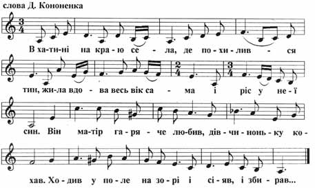 В хатин╕, на краю села, де похилився тин, Жила вдова весь в╕к сама ╕ р╕с у не╖ син. В╕н мат╕р гаряче любив, д╕вчиноньку кохав. Ходив у поле на зор╕ ╕ с╕яв, ╕ збирав...
