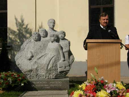 Останн╕й м╕сяць пройшов в Укра╖н╕ п╕д знаком видатного вчителя Василя Олександровича Сухомлинського, якого сьогодн╕ чи не краще знають за кордоном, н╕ж на батьк╕вщин╕. Китайц╕ пор╕внюють його з Конфуц╕╓м, там, як ╕ в багатьох ╕нших розвинених кра╖нах, прижилися започаткован╕ В. Сухомлинським «Школи радост╕». А народився в╕н 28 вересня 1918 року ╕ працював у звичайн╕с╕ньк╕й с╕льськ╕й школ╕. Йому було в╕дведене недовге життя – на 52 роц╕, т╕льки-но п╕шли д╕ти до школи (2 вересня), Вчителя не стало. Днями йому б виповнилося 90 рок╕в. Кажуть, окр╕м пам’ятника В. Сухомлинському, в Укра╖н╕ ╓ ще к╕лька скульптур, що ув╕чнюють вчителя, без╕менного, узагальненого, такий ╓, наприклад, у Харков╕. Щодо Криму, то чест╕ придбати в╕чне життя удосто╖вся поки що лише один вчитель, севастополець Пилип Дем’янович Безруков, який починав у 1949 роц╕ директором ╕ до 78 рок╕в пропрацював вчителем у школ╕ № 52 с. Верхньосадове Нах╕мовського району м. Севастополя. Останн╕й св╕й урок в╕н пров╕в за чотири дн╕ до роково╖ години, в╕ддавши ц╕й школ╕ 45 рок╕в життя. Зараз вона носить ╕м’я ц╕╓╖ св╕тло╖ людини, а на встановленому тут барель╓ф╕ ув╕чнен╕ риси його натхненного обличчя. Про все це я роздумувала 2 жовтня, оч╕куючи, коли поважн╕ люди перер╕жуть стр╕чку, ╕ я побачу пам’ятник вчителев╕, споруджений скульптором, заслуженим художником Укра╖ни Серг╕╓м Н╕к╕т╕ним за ╕н╕ц╕ативою ╕ на кошти КР╤ППО, яке очолю╓ професор Олександр Рудяков. Але, перш н╕ж це сталося, пролунало чимало промов знаних людей м╕ста, таких, як заступник м╕н╕стра осв╕ти АРК Айдер Аблятипов, сам Олександр Рудяков, одна з найстарших вчительок, доцент КР╤ППО Олена Антипова, заступник Пост╕йного Представника Президента в Криму Валер╕й Пробий-Голова, мер С╕мферополя Геннад╕й Бабенко. ╤ все це були тепл╕ слова на адресу вчителя, профес╕йне свято якого випада╓ цього року на 5 жовтня. Але говорили чомусь про вчителя з конкретною географ╕чною прив’язкою – кримського, хоча сам╕ далеко не вс╕ здобували осв╕ту в Криму. Вт╕м, зауважувалося, що кримський вчитель зазна╓ особливих труднощ╕в у зв’язку з пол╕тичними негараздами в наш╕й кра╖н╕. Та й пам’ятник, коли перер╕зали стр╕чку, зг╕дно з п╕дписом, виявився саме кримському вчителев╕, в╕рн╕ше, вчительц╕, оточен╕й д╕тьми. Скульптор Серг╕й Н╕к╕т╕н зауважив, що п╕сля останн╕х одержаних ним замовлень, коли доводилось зображувати щось, пов’язане з агрес╕╓ю, в╕н був радий створити пам’ятник, який випром╕ню╓ позитивну енергетику. Патетично, але доречно висловився директор с╕мферопольсько╖ г╕мназ╕╖ № 1 ╤гор Ковальов, який зауважив, що ма╓мо п╕дняти звання вчителя на недосяжну висоту, а представники влади похвалилися, н╕би щороку матер╕альне становище педагог╕в пол╕пшу╓ться. До п╕дн╕жжя пам’ятника було поставлено багато кошик╕в з кв╕тами. Адже саме кв╕тами споконв╕к вшановували працю тих, чия профес╕я вважалася одн╕╓ю з найшляхетн╕ших. Спод╕ва╓мося: вони кв╕тнутимуть тут завжди. Не дарма ж саме цього дня б╕ля пам’ятника вдруге розцв╕ли каштани.