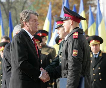 Президент Укра╖ни В╕ктор Ющенко взяв участь в урочистих заходах з нагоди Дня укра╖нського козацтва та Дня Укра╖нсько╖ повстансько╖ арм╕╖, як╕ в╕дбулися у Ки╓в╕ на Соф╕йськ╕й площ╕. У присутност╕ Глави держави в╕дбулося урочисте складання клятви новими л╕це╖стами в╕йськового л╕цею ╕м. ╤вана Богуна. В╕ктор Ющенко прив╕тав юних во╖н╕в ╕з ц╕╓ю визначною под╕╓ю у ╖хньому житт╕. «Вам випала велика честь навчатися у л╕це╖, який носить ╕м’я одного з найвидатн╕ших укра╖нських полководц╕в, легендарного козацького полковника ╤вана Богуна. Це був в╕рний сподвижник Богдана Хмельницького, лицар безмежно╖ в╕дваги, блискучий во╓начальник, для якого понад усе були честь, свобода ╕ Укра╖на. Будьте ж г╕дними його слави, слави вс╕х укра╖нських вояк╕в, як╕ з╕ збро╓ю в руках боронили В╕тчизну. Я в╕рю у вашу щасливу й звитяжну долю, бо ви склали клятву л╕це╖ста в святий день», – сказав Глава держави у сво╓му в╕тальному слов╕. Президент звернув увагу, що л╕це╖сти не випадково складають клятву на Соф╕йськ╕й площ╕, адже це – «святе м╕сце, яке уособлю╓ велич звитяг Укра╖нського духу ╕ збро╖». «Зв╕дси розпочиналися переможн╕ походи славних ки╖вських княз╕в Аскольда та Святослава. Тут Ярослав Мудрий розгромив печен╕г╕в ╕ на честь перемоги зв╕в найвеличн╕ший храм Укра╖ни – Соф╕ю Ки╖вську. На цьому майдан╕ в╕дбувалися паради в╕йськ Укра╖нсько╖ Народно╖ Республ╕ки. Тут крокували славн╕ С╕чов╕ стр╕льц╕ п╕д командуванням ╢вгена Коновальця. Саме на цьому святому м╕сц╕ 22 с╕чня 1919 року було проголошено ╕сторичний Акт Злуки Укра╖нсько╖ Народно╖ Республ╕ки та Зах╕дно-Укра╖нсько╖ Народно╖ Республ╕ки. Тут сто╖ть пам’ятник найславн╕шому козацькому полководцев╕ й творцев╕ Укра╖нсько╖ держави – гетьманов╕ Богдану Хмельницькому», – сказав В╕ктор Ющенко. Ушановуючи цього року юв╕лей Нац╕онально-визвольно╖ в╕йни укра╖нського народу п╕д проводом гетьмана Хмельницького, п╕дкреслив Глава держави, ми повинн╕ в╕дчути св╕й орган╕чний зв’язок з тими часами й тими под╕ями. «Укра╖на н╕коли не вела агресивних во╓н. Ми прагнемо миру, ми прагнемо дружби з ус╕ма нашими сус╕дами», – наголосив Президент. За його словами, стратег╕чна мета Укра╖ни – членство в об’╓днан╕й родин╕ ╓вропейських нац╕й ╕ над╕йний захист нашого суверен╕тету в ╓дин╕й ╓вроатлантичн╕й систем╕ колективно╖ безпеки. При цьому В╕ктор Ющенко п╕дкреслив, що необх╕дною запорукою незалежност╕ ╕ державност╕ ╓ сильне в╕йсько. У зв’язку з цим Президент нагадав слова Симона Петлюри: «Не забуваймо про меч, уч╕мося м╕цн╕ше тримати його в руках». В╕ктор Ющенко заявив, що як Президент ╕ Верховний Головнокомандувач Збройних Сил Укра╖ни зробить усе, щоб укра╖нський солдат, оф╕цер не в╕дчував браку н╕ в чому, що потр╕бно йому для достойного життя й ефективно╖ оборони р╕дно╖ земл╕. Президент пов╕домив, що найближчим часом ма╓ нам╕р п╕дписати Указ «Про Дн╕ укра╖нсько╖ во╓нно╖ звитяги», який окреслить ключов╕ переможн╕ дати укра╖нсько╖ ╕стор╕╖. «14 жовтня – День Покрови Пресвято╖ Богородиц╕, покровительки укра╖нського в╕йська, займа╓ у цьому ре╓стр╕ ч╕льне м╕сце», – сказав В. Ющенко. З нагоди свята Глава держави поклав кв╕ти до пам’ятника Богданов╕ Хмельницькому. * * * Понад 20 громадських орган╕з