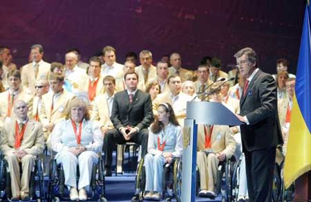 13 жовтня у Нац╕ональному палац╕ «Укра╖на» в╕дбулася урочиста церемон╕я вшанування чемп╕он╕в та призер╕в Х╤╤╤ Парал╕мп╕йських ╕гор за участ╕ Президента Укра╖ни В╕ктора Ющенка. «З великою рад╕стю в╕таю у ц╕й зал╕ чемп╕он╕в, призер╕в, учасник╕в XIII л╕тн╕х Парал╕мп╕йських ╕гор у Пек╕н╕, вс╕х тренер╕в, ус╕х, хто працював заради перемоги нашо╖ блискучо╖ команди. Я щасливий, що наш╕ парал╕мп╕йц╕ примножили ╕ розвинули спортивн╕ усп╕хи, ще б╕льше зм╕цнили спортивну славу кра╖ни. Двадцять чотири рази на спортивних аренах у Пек╕н╕ переможно лунав г╕мн Укра╖ни, с╕мдесят чотири рази майор╕в синьо-жовтий прапор. Це, безумовно, блискуча дипломат╕я нашо╖ нац╕╖, слава нашо╖ земл╕. Ми вдячн╕ вам ╕ пиша╓мося вами», - сказав у прив╕тальному слов╕ Глава держави. В╕ктор Ющенко назвав укра╖нських парал╕мп╕йц╕в «героями нац╕╖», зазначивши, що ╖хня перемога засв╕дчила те, що доля кожно╖ людини в ╖╖ власних руках, незалежно в╕д стану здоров’я. Перемога парал╕мп╕йц╕в - не лише пол╕тичний, але й моральний та естетичний урок, зазначив Президент Укра╖ни. Як сказав п╕д час урочисто╖ церемон╕╖ вшанування укра╖нських парал╕мп╕йц╕в м╕н╕стр Укра╖ни у справах с╕м’╖, молод╕ та спорту Юр╕й Павленко, усп╕х нашо╖ команди у Пек╕н╕ - результат системно╖ важко╖ чотирир╕чно╖ роботи. Були по╓днан╕ зусилля головного спортивного в╕домства кра╖ни, Парал╕мп╕йського ком╕тету Укра╖ни та центру «╤нваспорт». Укра╖нська команда протягом усього п╕дготовчого циклу мала чудов╕ умови для тренувань на баз╕ Центру парал╕мп╕йсько╖ п╕дготовки ╕ реаб╕л╕тац╕╖ в ╢впатор╕╖, що ╓ одн╕╓ю з кращих у св╕т╕, пот╕м пройшла повноц╕нну адаптац╕ю у Кита╖. За словами Юр╕я Павленка, нин╕ в Укра╖н╕ ╕сну╓ 114 центр╕в «╤нваспорту». «Цього замало. Головне наше завдання поляга╓ у тому, щоб так╕ центри були у кожному район╕, а спортивн╕ об’╓кти стали доступними для вс╕х людей з ф╕зичними вадами. Головне завдання влади ╕ сусп╕льства - зробити життя кожного ╕нвал╕да в наш╕й кра╖н╕ в╕льним, безбар’╓рним ╕ значущим», - п╕дкреслив м╕н╕стр. Президент Нац╕онального парал╕мп╕йського ком╕тету Укра╖ни Валер╕й Сушкевич щиро подякував ус╕м за п╕дтримку, яку команда в╕дчувала протягом змагань у Пек╕н╕. «Усп╕х парал╕мп╕йсько╖ зб╕рно╖ на ╤грах-2008 - це перемога всього укра╖нського спорту», - сказав в╕н. Валер╕й Сушкевич звернувся до центрально╖ влади, гол╕в обласних державних адм╕н╕страц╕й з проханням б╕льш серйозно ставитися до проблем громадян Укра╖ни з ╕нвал╕дн╕стю, як╕ нин╕ мають «нев╕дпов╕дний соц╕альний захист».