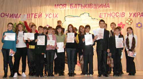 Нещодавно у ст╕нах с╕мферопольсько╖ г╕мназ╕╖ № 11 ╕м. К. Треньова в╕дбувся святковий концерт та урочиста церемон╕я нагородження учасник╕в та лауреат╕в Всеукра╖нського ╕сторико-л╕тературного конкурсу «Моя Батьк╕вщина очима д╕тей вс╕х етнос╕в Укра╖ни». Чотири громадськ╕ орган╕зац╕╖ Укра╖ни - «Всеукра╖нська м╕жнац╕ональна ж╕ноча громада», М╕жнародна громадська Академ╕я «Модус Колор╕с», Харк╕вська в╕рменська нац╕ональна громада та М╕жнародна благод╕йна орган╕зац╕я «М╕жнародний центр сприяння реорган╕зац╕╖ системи охорони здоров’я в Укра╖н╕» за п╕дтримки М╕н╕стерства осв╕ти ╕ науки Укра╖ни та Державного ком╕тету Укра╖ни у справах нац╕ональностей та рел╕г╕й протягом 2008 року провели цей конкурс. За словами орган╕затор╕в, метою конкурсу ╓ виявлення та п╕дтримка обдаровано╖ молод╕, виховання у п╕дростаючого покол╕ння нац╕онально╖ самосв╕домост╕, шанобливого ставлення до мов, культур, традиц╕й та ╕стор╕╖ ус╕х народ╕в Укра╖ни. Проводиться в╕н за чотирма ном╕нац╕ями: «╤стор╕я розвитку духовного життя в Укра╖н╕», «Л╕тература», «Р╕дна мова» та «╤сторико-культурний д╕алог». Щодо робочих мов конкурсу, то це - державна мова, а також мови нац╕ональних меншин, як╕ проживають на територ╕╖ нашо╖ кра╖ни. Нав╕ть у першому пункт╕ положення про конкурс зазначено: «Всеукра╖нський ╕сторико-л╕тературний конкурс «Моя Батьк╕вщина очима д╕тей р╕зних етнос╕в Укра╖ни» ╓ в╕дкритим, патр╕отично-громадянським заходом, який спрямований на виховання толерантност╕, культури добросус╕дства громадян Укра╖ни незалежно в╕д ╖х нац╕онально╖, расово╖ чи духовно-рел╕г╕йно╖ приналежност╕». На церемон╕ю нагородження у С╕мферополь при╖хали лауреати та учасники конкурсу з р╕зних куточк╕в Криму. Д╕ти з рад╕стю отримували подарунки та грамоти ╕з рук Олени Оганесян (на фото праворуч), члена жур╕ конкурсу. Цьогор╕чними лауреатами конкурсу «Моя Батьк╕вщина очима д╕тей вс╕х етнос╕в Укра╖ни» стали: Серг╕й Германович (м. Саки), Алла Л╕совська (м. Красноперекопськ), Артур Петросян (м. С╕мферополь), Максим Бесарабов (м. ╢впатор╕я), Катерина Самардак (сел. Нижньог╕рський), Андр╕й Поворозний (с. Майське) та ╕н. 50 учасник╕в конкурсу представляли 17 нац╕ональностей та етнос╕в Криму. «За ними - майбутн╓ кра╖ни», - зазначили члени жур╕ конкурсу: к╕норежисер Р. Балаян, художник А. Мадяр, осв╕тяни, громадськ╕ д╕яч╕, п╕дпри╓мц╕ та ф╕лологи: М. Колесник, Л. Богдан, С. Хандам╕рян, О. Оганесян на чол╕ з директором ╤нституту л╕тератури НАНУ М. Жулинським. Колектив школи на чол╕ з директором Миколою ╤ошиним за п╕дтримки друз╕в та колишн╕х випускник╕в-г╕мназист╕в порадував ус╕х присутн╕х чудовим концертом. Участь у ньому взяли скрипал╕, сп╕ваки, ансамбл╕ та зразков╕ художн╕ колективи: зразковий колектив Укра╖ни «Арарат», хореограф╕чний ансамбль г╕мназ╕╖ № 11 ╕м. К. Треньова, ансамбль скрипал╕в «Сельсеб╕ль» Кримського державного ╕нженерно-педагог╕чного ун╕верситету, вокальний ансамбль «Екзальте» та ╕н. П╕д час концерту звучали п╕сн╕ укра╖нською, в╕рменською, кримськотатарською, рос╕йською мовами, а також ╕диш. Пал╕тра культур, яка заграла ус╕ма кольорами веселки п╕д час концерту, п╕дтвердила не лише те, що суть цього конкурсу – вза╓морозум╕ння, а й те, що щирим серцям лег