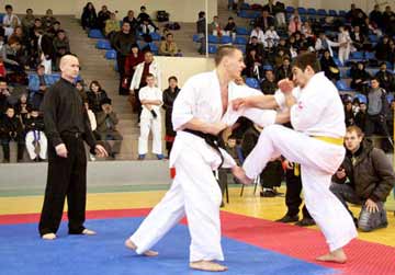 Карате по сут╕ сво╖й ╓ мистецтвом перемоги над самим собою. Нещодавно у С╕мферопол╕ за п╕дтримки Республ╕канського ком╕тету АРК з ф╕зично╖ культури ╕ спорту, Нац╕онально╖ федерац╕╖ к╕окушин кан шогакукай карате Укра╖ни, Кримського республ╕канського в╕дд╕лення, в╕дд╕лення Нац╕онального ол╕мп╕йського ком╕тету Укра╖ни в АРК, управл╕ння у справах неповнол╕тн╕х, с╕м’╖, молод╕, ф╕зично╖ культури ╕ спорту С╕мферопольсько╖ м╕сько╖ ради в╕дбувся Всеукра╖нський турн╕р з к╕окушин кан карате, який був присвячений виводу радянських в╕йськ з Афган╕стану. У змаганнях взяли участь команди з Одеси, Херсона, Запор╕жжя, Микола╓ва, Ки╓ва та Криму (Алушти, Джанкоя, Бахчисарая, ╢впатор╕╖, Красноперекопська, С╕мферополя, С╕ме╖зу, Судака, Феодос╕╖, смт. Чорноморського, Щолк╕ного, Ялти, Керч╕, К╕ровського та Лен╕нського район╕в) в╕д спортивних орган╕зац╕й к╕окушин кан, к╕окушин, аш╕харо, дайдоджуку карате, тайського боксу, самбо ╕ дзюдо федерац╕й – всього 188 спортсмен╕в, з них – 21 д╕вчина. У командному зал╕ку перше м╕сце виборов Крим, друге – команда з Микола╓ва, трет╓ – ╕з Запор╕жжя. За словами головного судд╕ турн╕ру В╕ктора Ушакова, заслуженого тренера Укра╖ни з карате (3-й дан), судд╕вська бригада турн╕ру складалася б╕льше н╕ж з 25 майстр╕в сх╕дних ╓диноборств, ╕ якщо виникали сп╕рн╕ питання, то вони вир╕шувалися на нарадах судд╕в. Заслужений тренер Укра╖ни з карате вважа╓, що турн╕р вдалося провести усп╕шно ╕ на високому р╕вн╕. Загалом, кр╕м цього традиц╕йного турн╕ру, який проводиться ось уже майже в╕с╕м рок╕в посп╕ль, протягом року кримчани орган╕зовують ще близько 15-16 чемп╕онат╕в на територ╕╖ п╕вострова, ╕ беруть участь у 4 – 8 турн╕рах на територ╕╖ Укра╖ни та поза ╖╖ межами. У рамках цього турн╕ру також в╕дбулася зустр╕ч з м╕жстильових бо╖в: представники к╕окушин кан карате протиставляли свою техн╕ку, ум╕ння, навички та силу духу ум╕нням та навичкам майстр╕в ╕нших вид╕в ╓диноборств. Орган╕затори турн╕ру зробили все можливе, аби б╕йц╕вськ╕ пари у м╕жстильових протистояннях складалися лише з г╕дних супротивник╕в. Кр╕м того, п╕д час турн╕ру в╕дбулася презентац╕я книги сенсея В╕ктора Ушакова п╕д назвою: «Сучасн╕ та традиц╕йн╕ методики в практиц╕ бойових мистецтв», у як╕й, за словами автора, в╕н намага╓ться дати в╕дпов╕дь на т╕ питання, як╕ виникали у нього самого п╕д час вивчення карате, але в╕дпов╕д╕ на як╕ в╕н в╕дшукав самотужки, практикуючи ╕ вдосконалюючи власне волод╕ння сх╕дним бойовим мистецтвом. Нам випала щаслива нагода посп╕лкуватися ╕з сенсе╓м, ╕ ось що в╕н розпов╕в про себе, про сво╓ бачення бойових мистецтв загалом, ╕ карате зокрема: «Я займаюся карате практично все сво╓ життя. Вважаю, що карате – це ун╕версальний зас╕б, який да╓ можлив╕сть розвивати розум ╕ збагачувати душу. Це – не спорт, це той метод, який да╓ людин╕ змогу самовдосконалюватися. На в╕дм╕ну в╕д спорту, в якому ор╕╓нтуються виключно на результат, в карате не важливо, хто виграв, а хто програв... Важливо, як людина поводилася п╕д час бою! ╤ «переможений», хоча це слово не зовс╕м коректне у даному випадку, якщо в╕в себе г╕дно, ма╓ ус╕ т╕ сам╕ здобутки, що й «переможець». У програш╕ з честю сильному супротивников╕ нема╓ н╕чого ганебного», – впевнений В╕к