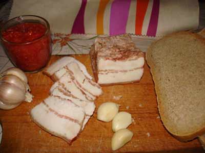 Звичайно ж здивувати когось салом у «кра╖н╕ сало╖д╕в» Укра╖н╕ справа майже безнад╕йна, та й тако╖ мети у мене нема╓. Просто хочеться зайвий раз п╕дкреслити наск╕льки ж воно важливе та багатозначне для укра╖нц╕в. Мен╕ зда╓ться, що на р╕вн╕ з укра╖нським борщем сало м╕стить в соб╕ певний сакральний зм╕ст. Але спочатку трохи ╕стор╕╖. Як не дивно батьк╕вщиною сала ╓ зовс╕м не Укра╖на. ╤дея використання свинячого жиру як дешево╖ та калор╕йно╖ ╖ж╕ народилася ще понад 3000 рок╕в на територ╕╖ сучасно╖ ╤тал╕╖ (так-так, в Римськ╕й ╕мпер╕╖). Тод╕ сало входило в рац╕он раб╕в, як╕ працювали на важких роботах у мармурових копальнях. Як в╕домо, римляни славилися сибаритством та гурманством. Нав╕ть рабам вони не пропонували сире несмачне сало, а попередньо його готували – шпигували гострими спец╕ями, приправами та р╕зноман╕тними прянощами: базил╕ком, фенхелем, ан╕сом, часником, перцем тощо. Завдяки ╖м ця скромна страва набувала неймов╕рно чудового аромату та незвично неперевершеного смаку. Як св╕дчить ╕стор╕я, завдяки цим якостям надал╕ сало, приготовлене в такий спос╕б, з’явилося нав╕ть на стол╕ у примхливих, розбещених та вибагливих на р╕зносоли патриц╕╖в-римлян. Тим, що сало з’явилося в нашому рац╕он╕, треба подякувати Золот╕й Орд╕. Як в╕домо, татаро-монголи для пров╕анту в╕йська забирали всю худобу, окр╕м свиней, яких вони не вживали з рел╕г╕йних настанов, вважаючи ╖хн╓ м’ясо – в╕д «нечисто╖ та нечестиво╖ тварини». Що ж, цю особлив╕сть п╕дкорен╕ слов’яни швидко «уловили» ╕ почали у великих к╕лькостях вирощувати свиней. Так сало допомогло пережити тяжке лихол╕ття, пов’язане з нашестям татаро-монгол╕в. Треба сказати, що до сала ставилися з певною пошаною та терпимо ╕ в Середньов╕чн╕й ╢вроп╕. Так, сам святий Бенедикт, засновник в╕домого католицького ордену бенедиктинц╕в, дозволяв ченцям вживати цей продукт. ╢ св╕дчення, що в╕дкриття Америки теж певним чином пов’язане з салом. Адже якби в запасниках мореплавц╕в, як╕ вирушали до ╤нд╕╖ (така була задумка в╕дкриття нового шляху до не╖, рухаючись на Зах╕д), не було б цього продукту – поживно╖ ╕ калор╕йно╖ добавки до рац╕ону – навряд чи в╕дбулося б в╕дкриття Америки... Адже морякам було в╕домо, що на в╕дм╕ну в╕д ╕нших м’ясних продукт╕в, сало можна було зберегти св╕жим до п╕вроку, а в╕дпов╕дно законсервоване (засолене) ╕ того довше. Ну, а про чудод╕йн╕ властивост╕ сала та здатн╕сть його в╕дновлювати силу та енерг╕ю тих, хто «перекусив» ним, вже тод╕ ходили легенди.