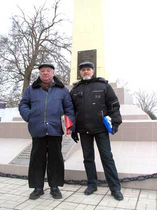 На фото: Дмитро Крицький (л╕воруч) ╕ його приятель п╕дполковник у в╕дставц╕ Володимир Папанов б╕ля пам’ятника на але╖ Геро╖в у центр╕ Новофедор╕вки; пам’ятник загиблому ек╕пажу Ту-22.