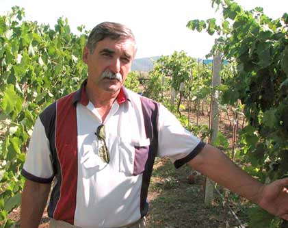 На зн╕мку: Леон╕д Древецький у сво╓му колекц╕йному винограднику. Серпень 2010 року. Фото автора.