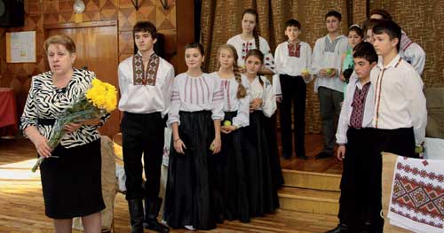 На фото: директор Кримського «Центру еколого-натурал╕стично╖ творчост╕ учн╕всько╖ молод╕» О. М. Бродська дяку╓ юним артистам театрально╖ студ╕╖ «Св╕танок» за прекрасно з╕грану виставу про долю Симиренка