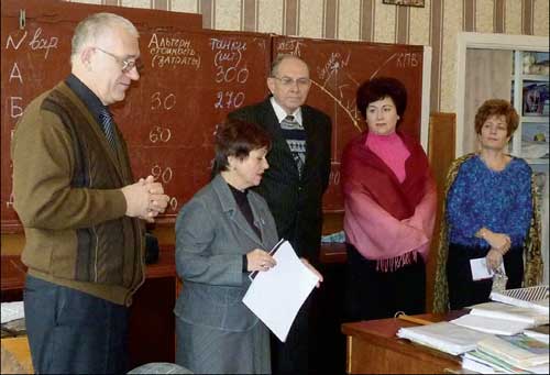 На фото: директор школи № 4 Олександр ╢мець, методист з укра╖нсько╖ мови ╕ л╕тератури ╤ПО СМГУ Валентина Лопатюк, Микола Владз╕м╕рський, учитель Тамара М╓шкова та завуч з виховно╖ роботи Марина Лебед╓ва.