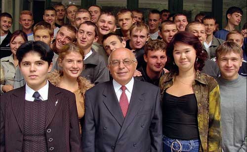 Декан сп╕льного факультету нафтогазових технолог╕й ╤вано-Франк╕вського нац╕онального техн╕чного ун╕верситету нафти ╕ газу ╕ Кримсько╖ академ╕╖ природоохоронного ╕ курортного буд╕вництва професор Р. С. Ярем╕йчук з╕ сво╖ми вихованцями (2003 р.)