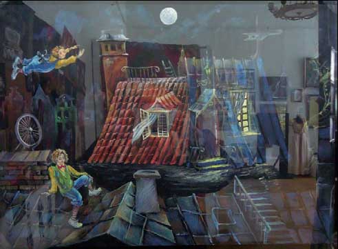 На фото: еск╕з декорац╕й до вистави за п.╓сою «Малюк та Карлсон, що живе на даху», Т. Карасьов