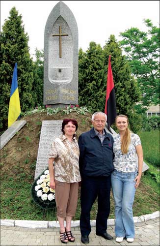 На фото (зл╕ва направо): Оксана Морик╕т, Дмитро Павличко ╕ Юл╕я Качула б╕ля пам’ятника воякам УПА у Стопчатов╕