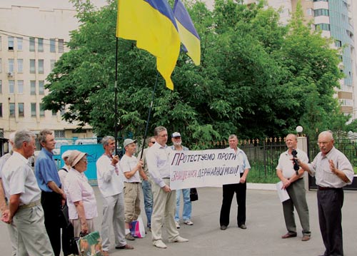 Заступник голови «Укра╖нсько╖ громади Криму» Петро Смолян╕нов (крайн╕й праворуч на фото) виступа╓ на м╕тингу на захист державно╖ укра╖нсько╖ мови б╕ля Представництва Президента Укра╖ни в Криму