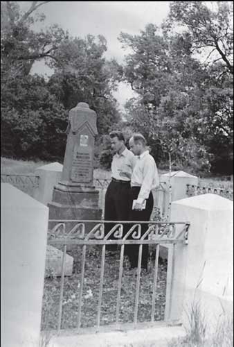 На фото: Микола Горбович та Петро Вольвач на могил╕ основоположника в╕тчизняного л╕с╕вництва Георг╕я Морозова у Салг╕рц╕. 1960 р.