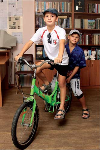 На фото — учасники конкурсу с╕мферопольц╕ Руслан ╕ Женя Ем╕нови з призовим велосипедом
