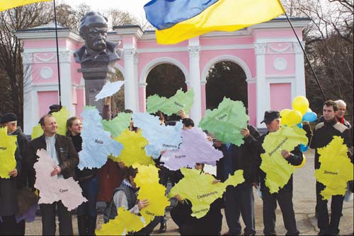 На користь ╓дино╖ соборно╖ Укра╖ни виступа╓ ╕ кримська молодь, що й продемонстрували учасники громадсько╖ орган╕зац╕╖ «Укра╖нський д╕м», як╕ прийшли на м╕тинг, що в╕дбувся б╕ля пам’ятника Тарасу Шевченку, аби скласти ╕з вир╕заних з паперу контур╕в областей велику Укра╖ну (на фото) та ще й розпов╕сти, чим же славний кожен ╖╖ рег╕он. Та це вже п╕сля того, як прозвучали останн╕й виступ та резолюц╕я м╕тингу, на якому теж з’явилися нов╕ люди.